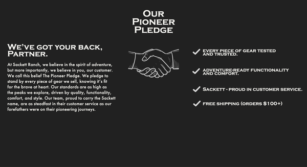 At Sackett Ranch, we believe in the spirit of adventure, but more importantly, we believe in you, our customer. We call this belief The Pioneer Pledge. We pledge to stand by every piece of gear we sell, knowing it's fit for the brave at heart. Our standards are as high as the peaks we explore, driven by quality, functionality, comfort, and style. Our team, proud to carry the Sackett name, are as steadfast in their customer service as our forefathers were on their pioneering journeys.