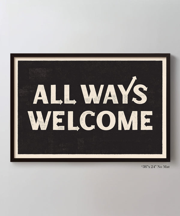 This minimalistic typography poster is our take on the popular saying, "All Ways Welcome." If you look closely, you'll see different directional arrows within the lettering representing the different "ways" of the phrase. This large-format piece is perfect for your western or southwestern entryway, but also makes a great addition to an eclectic or boho gallery wall!