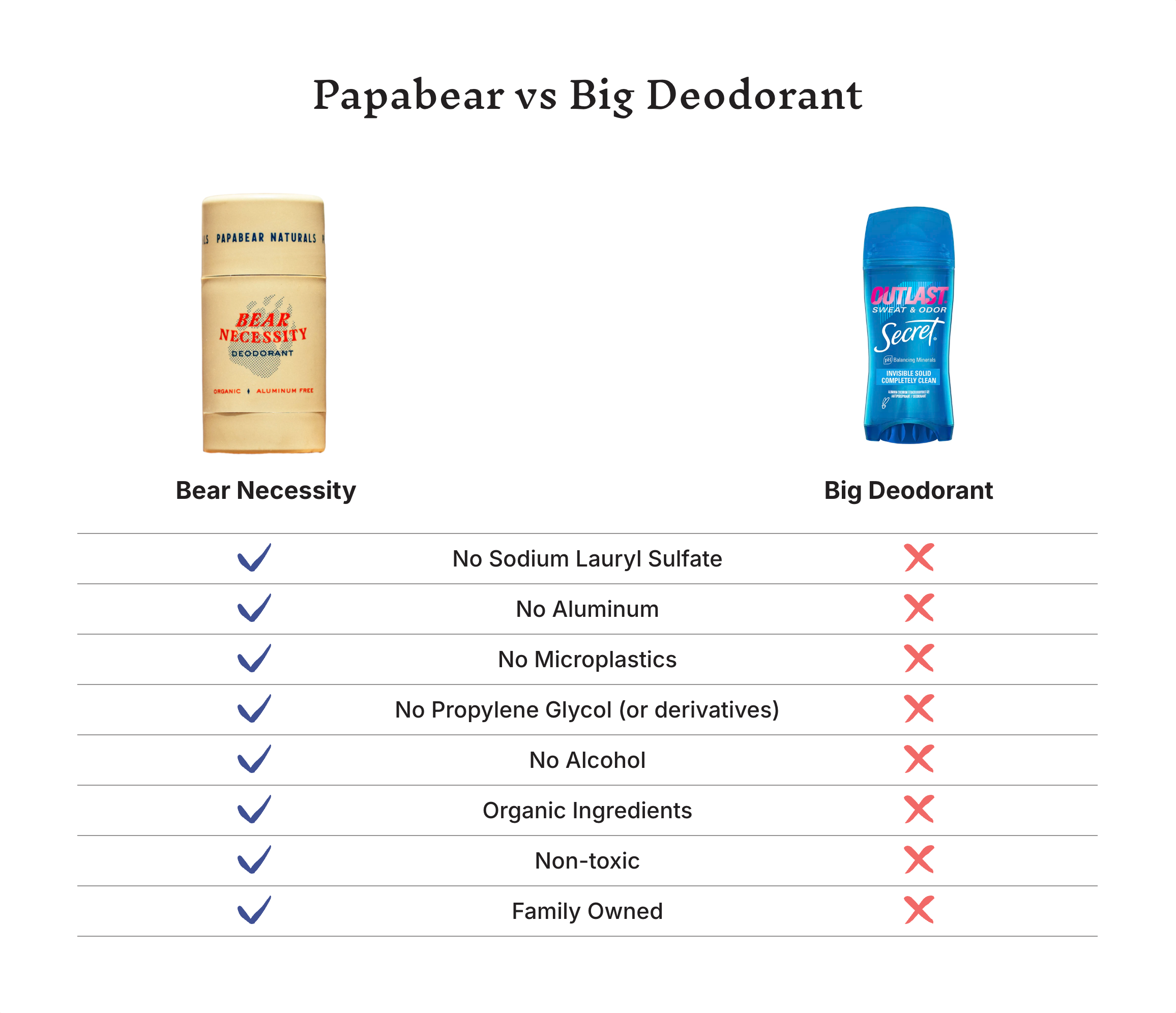 For years deodorant companies have scared their customers into using antiperspirants (aka aluminum… yes the metal) loaded with artificial fragrances (aka endocrine disruptors) to stop the sweating altogether out of a valid fear of smelling bad. How is that healthy? It’s not! That’s why Papabear focuses on the root problem and only uses ingredients that work with your body to balance the microbial environment on your skin and eliminate the odor.