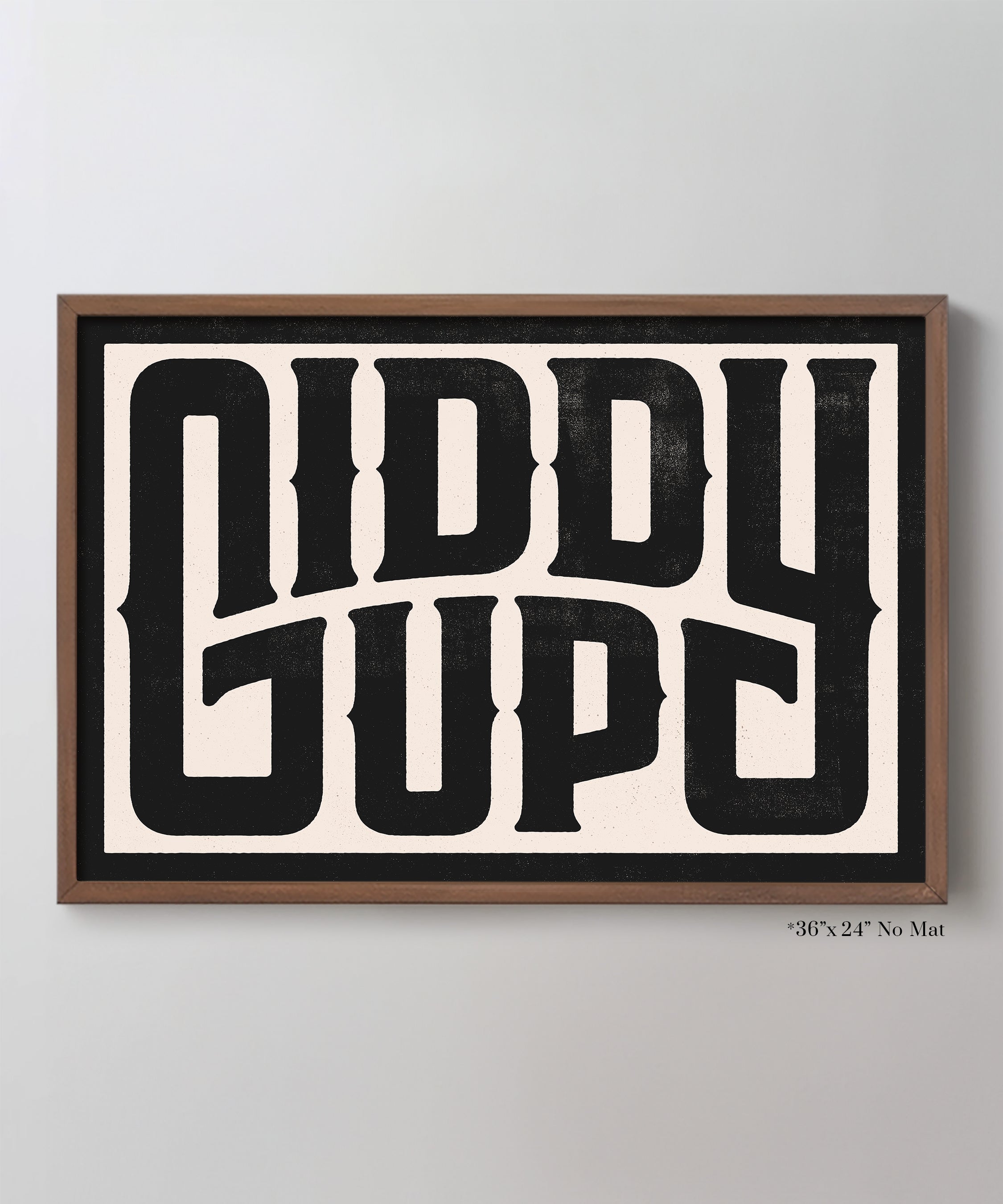 This bold art print is our take on the popular western saying, "Giddy Up!" Made from custom-designed type, this piece is perfect for the rider in your family.