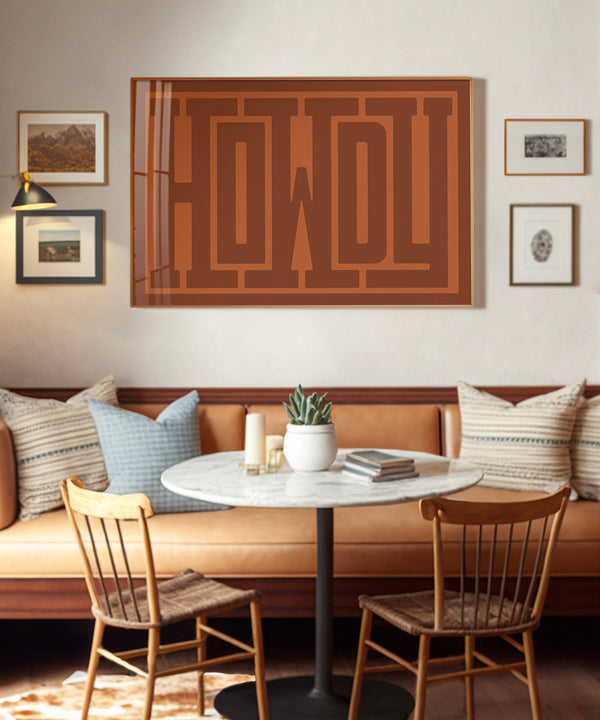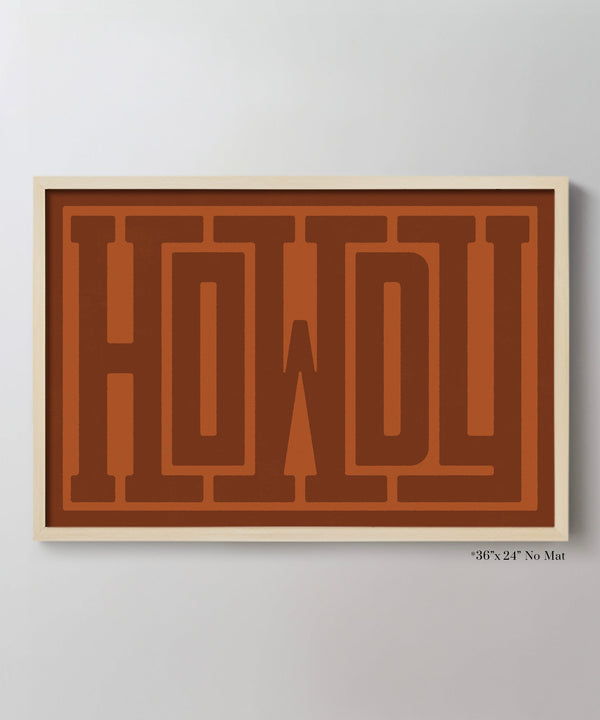 We wouldn't be a Western print shop if we didn't have a Howdy print, now would we? This modern typographic poster will be sure to add a bold touch to your Southwestern walls. Goes great in any entryway, kitchen, or living room, and makes a nice addition to an eclectic or bohemian gallery wall.
