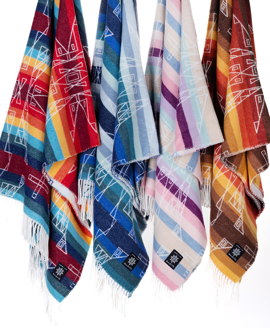 The first step to the making of our blankets is gathering donated clothing and factory scraps, saving fabric from the landfill. The recycled fabrics are then shredded into fibers in a water-free, chemical-free carding process. The fibers from carding are combined with fibers of different colors to create a unique palette without ever touching dye - and then is spun into yarn. The yarn is given new life and is woven into our blankets on a Jacquard loom. Once the fabric is woven, it is brushed and shaved to enhance softness. After the brushing process the warp yarn is twisted on both ends of the blanket to create our signature tassels. Lastly, each blanket is rigorously quality checked to ensure it is free of defects and flaws. Experience quality and craftsmanship in our blankets, proudly finished in the USA for an authentic touch.