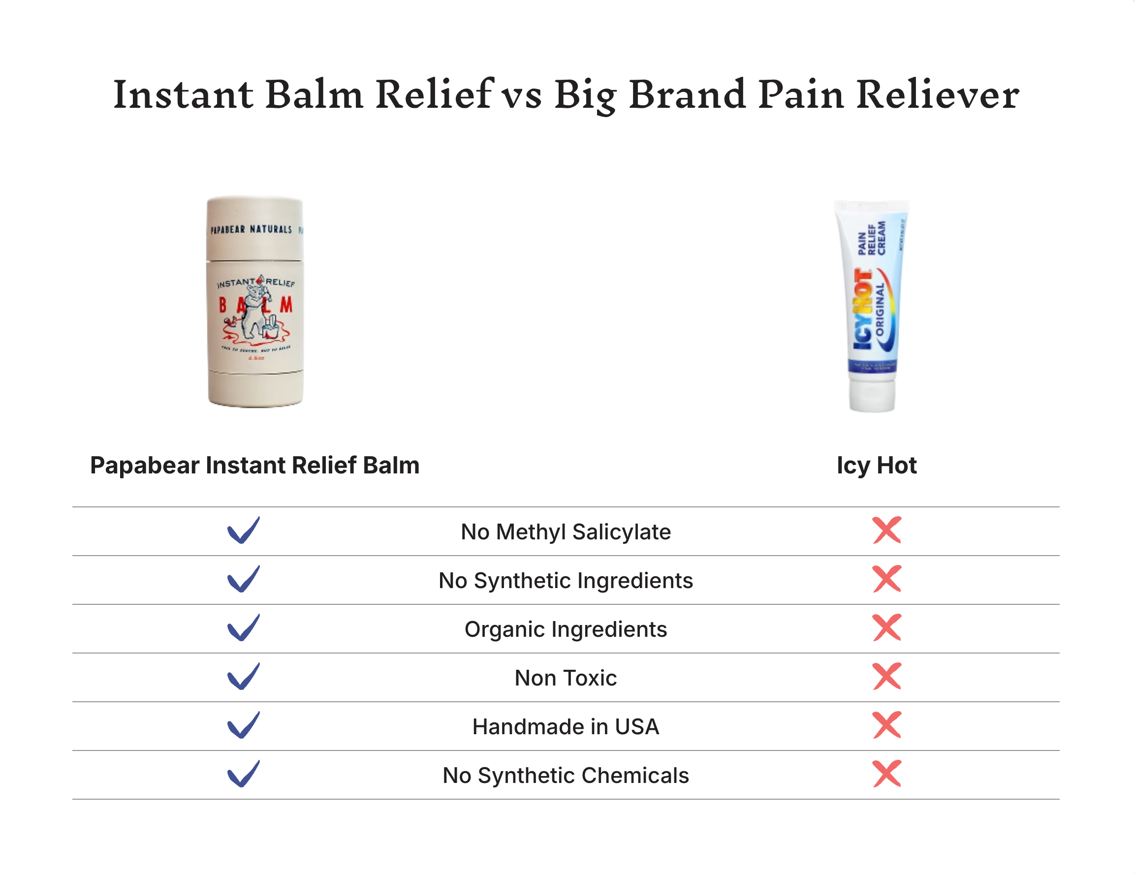 Our Instant Relief Balm takes a different approach: using time-tested, natural ingredients that work with your body rather than against it. With no harsh chemicals, no artificial fillers, and no questionable additives, you get pure, effective relief the way nature intended.