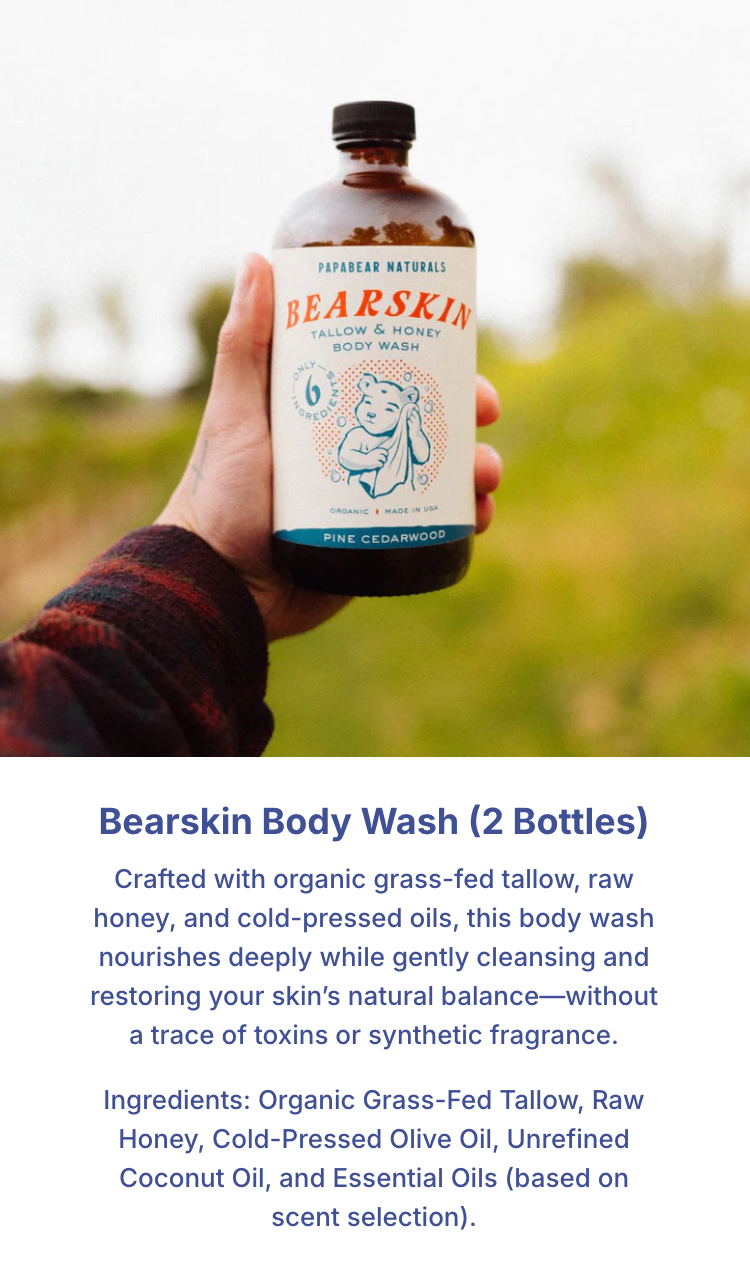 Includes 1x Restorative Tallow Balm, 2x Bearskin Body Wash, 5x Tallow Lip Balm, 1x Rejuvenating Face Wash, 1x Revival Eye Cream, 4x Grass-Fed Tallow Soap.