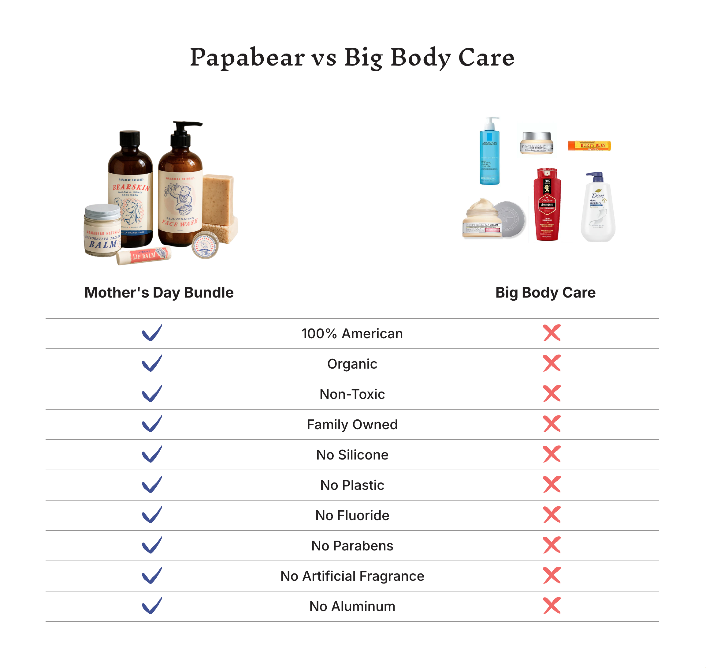 Mainstream skincare brands don’t care enough about Mom. They load their products with hormone disruptors, synthetic preservatives, and mystery fragrances—all in the name of “beauty.” But the truth is, Big Body Care has one priority: profit, not people. That’s not how we do things at Papabear.