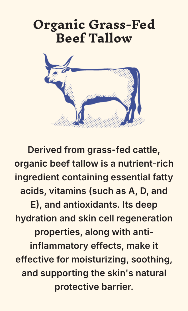 Our blend of organic grass-fed beef tallow, cold-pressed olive oil, local honey, and beeswax is a natural powerhouse, perfect for everyday use. It provides deep hydration, soothes inflammation, and forms a protective barrier, making it effective for acne, eczema, rosacea, psoriasis, and sunburns.