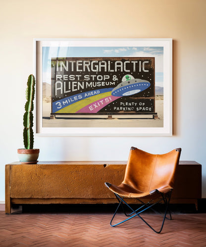 This piece is print #3 in our Road Trip Attractions Series - a collection inspired by the interesting and quirky establishments you'll see billboards for on a road trip out west. This print is the billboard for the Intergalactic Rest Stop and Alien Museum. Come grab a cosmic snack as you look at UFO artifacts recovered in the desert. If you're lucky you might even get abducted!