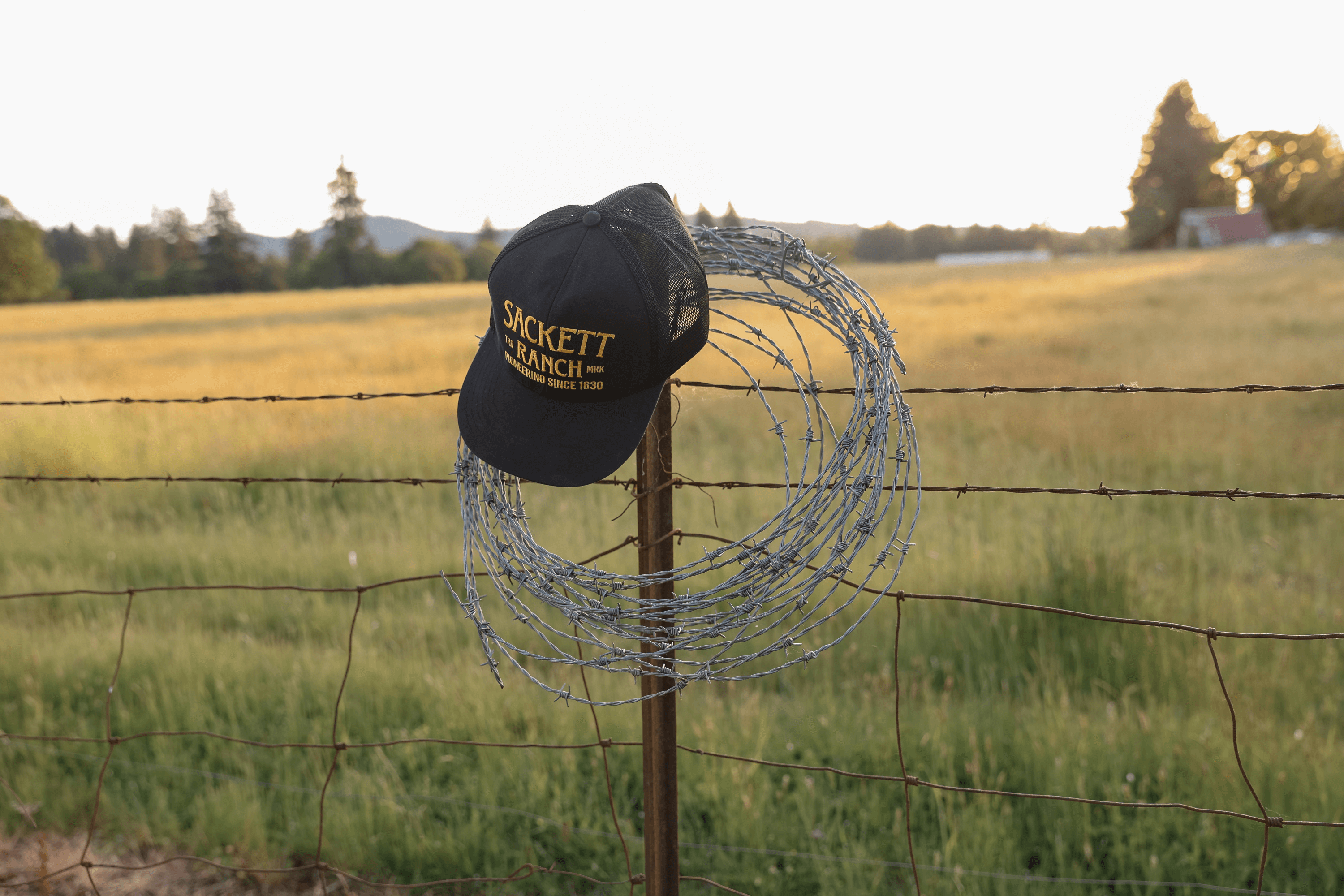 Simple. Classic. Unshakably American. This black 6-panel trucker is cut from durable cotton fabric sourced from the same historic US textile mill as our waxed canvas version. It’s embroidered with the Sackett Ranch badge and “Pioneering Since 1630” motto for a look rooted in legacy. Made entirely in the USA—down to the snapback and stitching—and finished with our SR leather pinch tag, this is your go-to hat for everyday wear that stands for something.